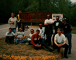 so we finally blocked the dog off from We made it back to Hiawassee in record time (good thing I bought the V rated tire, it is amazing the kind of velocity one can achieve riding down a mountain with a tailwind...) After we all examined the mysterious force that was eating away at the bottom of Rick Landi's Fairing, foot pegs and center stand we decided to head back into town to "the restaurant." On the way into Hiawasse I found out that not only does Mike Schen's K75 occasionally erupt with a terrific backfire, at night this seems to be accompanied by a fireball as big as a softball. Now I know what Batman would ride if he were cool enough to have a bike. Unfortunately word of "the restaurant" had spread and there was simple no room for us. Luckily we had our face screens open and chanced upon the most delicious Bar-B-Q smell wafting across the road. We had found another gem, a place where one could walk into the screened porch from the order counter with a half a pound of shredded beef Bar-B-Q, a pint of Brunswick Stew, a double scoop of mustard cole slaw, two scratch-biscuits and all the iced tea one could drink for under $5.00! You'd think they had never heard of tourists before! We all laughed and carried on, filled Terry and Edwina in on the Gap run, and generally had a great time till the owners started locking and unlocking the front door and setting up lounge chairs out front. We all got the hint and headed back to camp (I made a side trip to the Food King to get chili, hot dogs, mustard and buns for a surprise midnight snack.) The rest of the night is a little hazy as I had a bit too much of that "house brand" Bar-B-Q but I do seem to remember smoking cigars with Richard Bernecker, drinking with everyone down at Scott Adams' tent, and finally ending up late night talking with Pat Roddy and Rick Landi about all sorts of things. On to Day 4... |